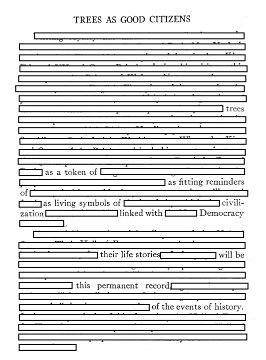 I’m working on a new zine right now made up entirely of whiteout poetry, using text from books that are in the public domain. The original inspiration comes from Trees as Good Citizens by Charles Lathrop Pack, which I found at a tour of Occidental College’s Moore Lab of Zoology. Here’s a sneak peek at the title poem: